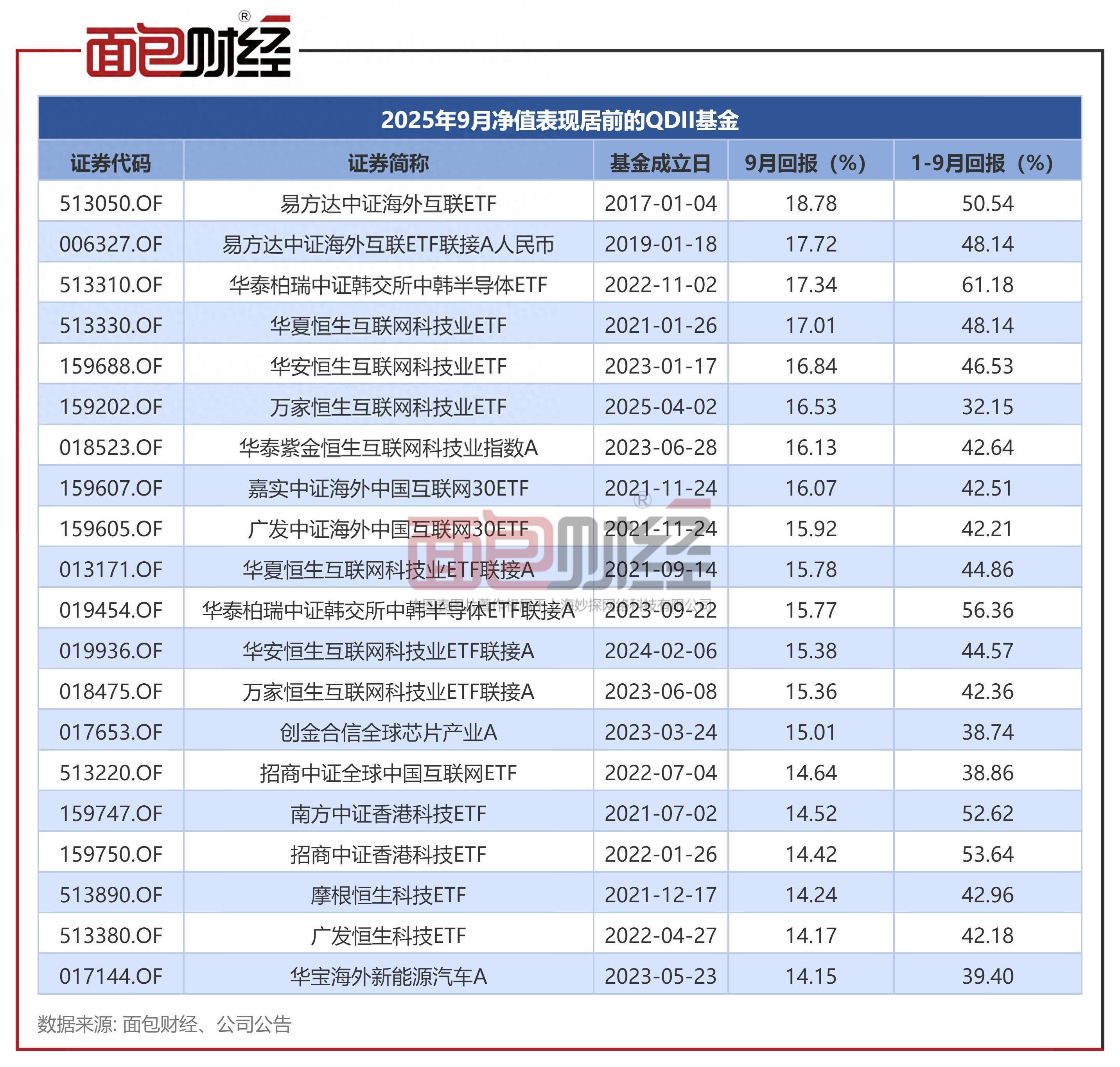 数据显示,9月份,易方达中证海外互联ETF、华夏恒生互联网科技业ETF、创金合信全球芯片产业A等QDII基金表现居前。