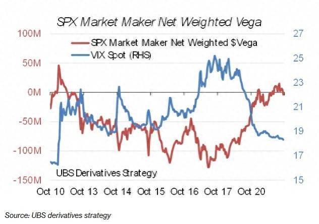 瑞银策略师Kieran Diamond等人指出,10月16日当天,标普500指数期权的做市商在市场下跌时持有的波动率头寸变得更为“空头化”,当这些头寸被回补时,可能进一步放大了VIX的飙升。此外,交易员可能还持有VIX看涨期权的空头仓位,对这些仓位进行对冲的操作也助推了波动率的上升。