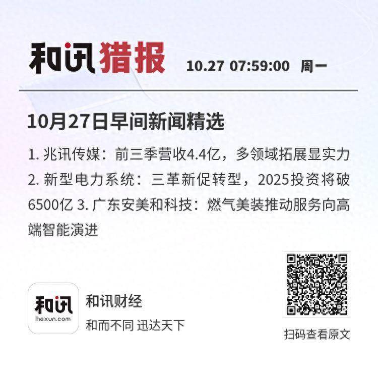 10月27日早间新闻精选1. 兆讯传媒:前三季营收4.4亿,多领域拓展显实力2. 新型电力系统:三革新促转型,2025投资将破6500亿3. 广东安美和科技:燃气美装推动服务向高端智能演进