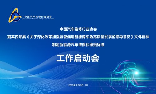 2025年12月29日,中国汽车维修行业协会落实国家金融监督管理总局、工业和信息化部、交通运输部、商务部等四部委联合印发的《关于深化改革加强监管促进新能源车险高质量发展的指导意见》、制定完善新能源汽车维修和理赔标准工作启动会在北京顺利召开。中国汽车维修行业协会会长张延华、秘书长底彦彬,交通运输部公路科学研究院汽车运输研究中心副主任、全国汽车维修标准化技术委员会秘书长魏显威,中国精算师协会副秘书长李劲松,国家市场监督管理总局缺陷产品召回技术中心卢逸名等出席会议,来自全国的地方汽车维修行业协会、汽车生产企业、汽车维修企业、主要财险机构、科研院所的相关负责人共130余人参加会议。会议由底彦彬主持。