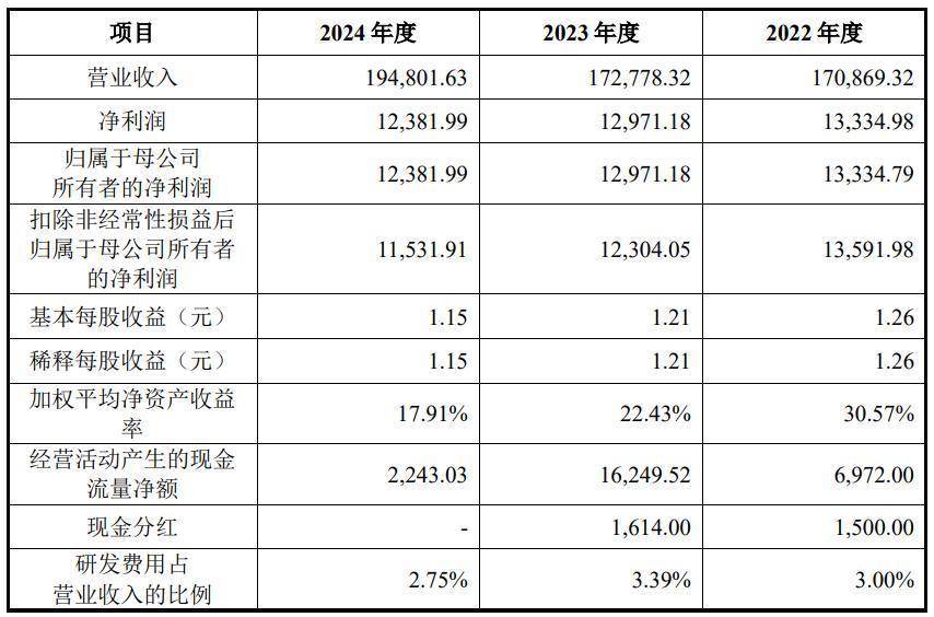 财务方面,于2022年、2023年及2024年,公司实现营业收入分别约为17.09亿元、17.28亿元、19.48亿元人民币;同期净利润分别约为1.33亿元、1.30亿元、1.24亿元人民币。丰倍生物称,2022年至2023年经营活动现金流量情况良好,2024年经营活动现金流量净额有所下降,主要是经营性应收项目余额增长所致。
